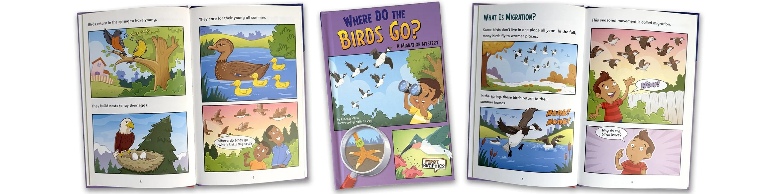 A children’s graphic novel explaining why birds migrate. Covering topics such as seasonal changes, finding food and traveling to warmer climates. Part of the “First Graphics: Science Mysteries” series.