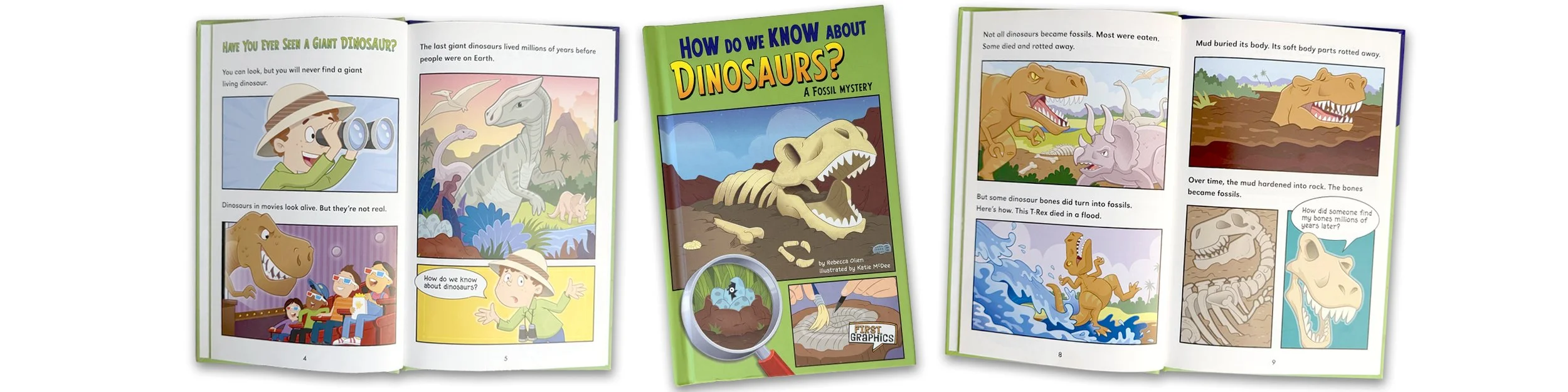 Using a graphic novel format, this fossil mystery teaches kids how fossils reveal information about dinosaurs! It covers fossil types, scientific inquiry, and how paleontologists infer their behavior and diet. Part of the “First Graphics: Science Mysteries” series.