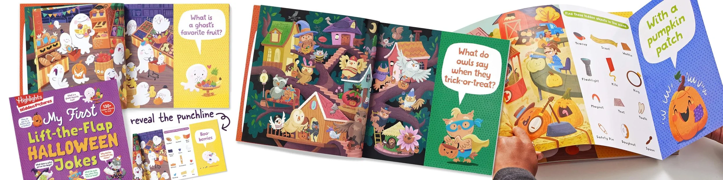 What do you get when you cross Halloween Hidden Pictures fun with lift-the-flap-jokes? A monstrously silly Halloween kids book!